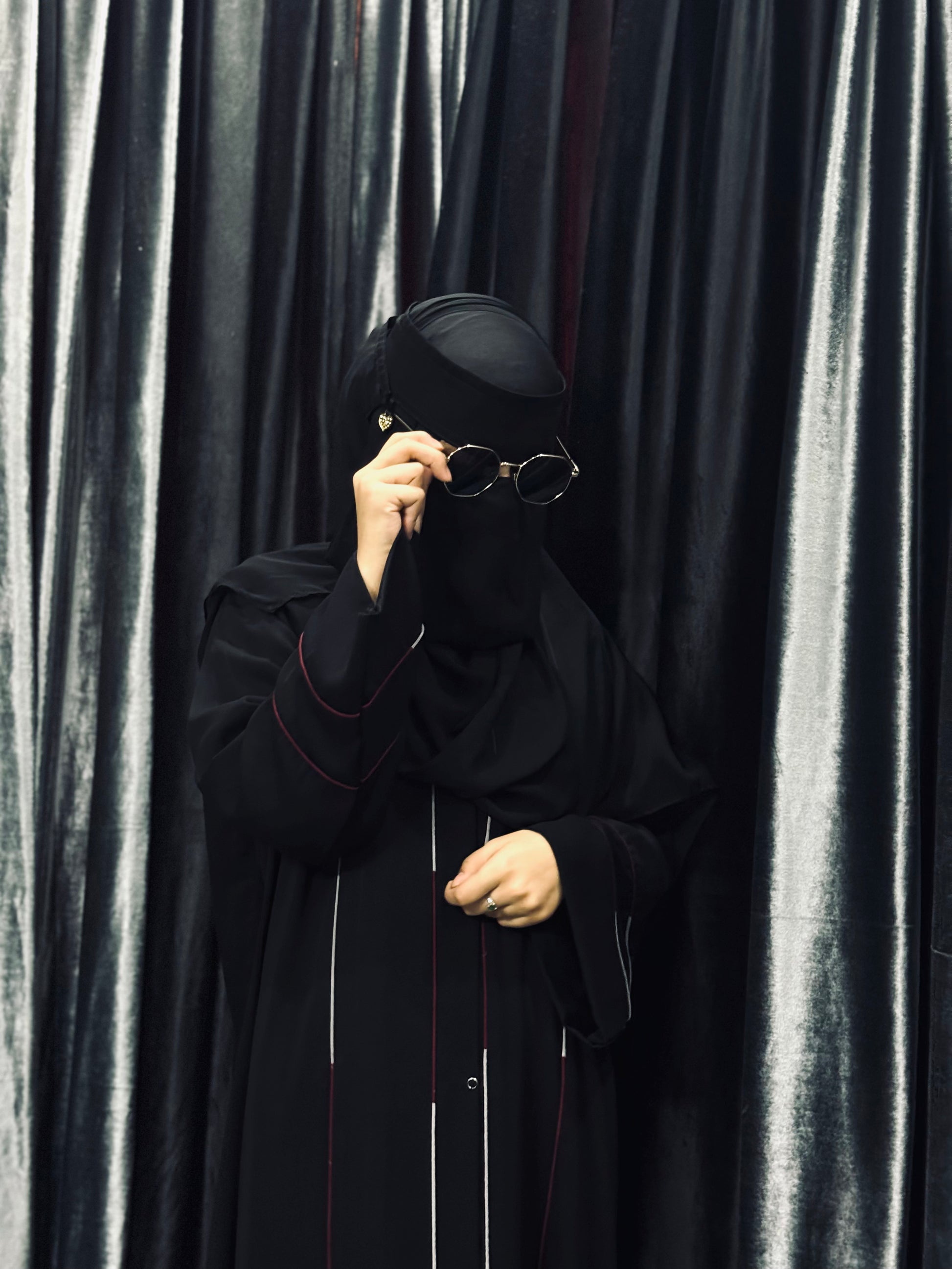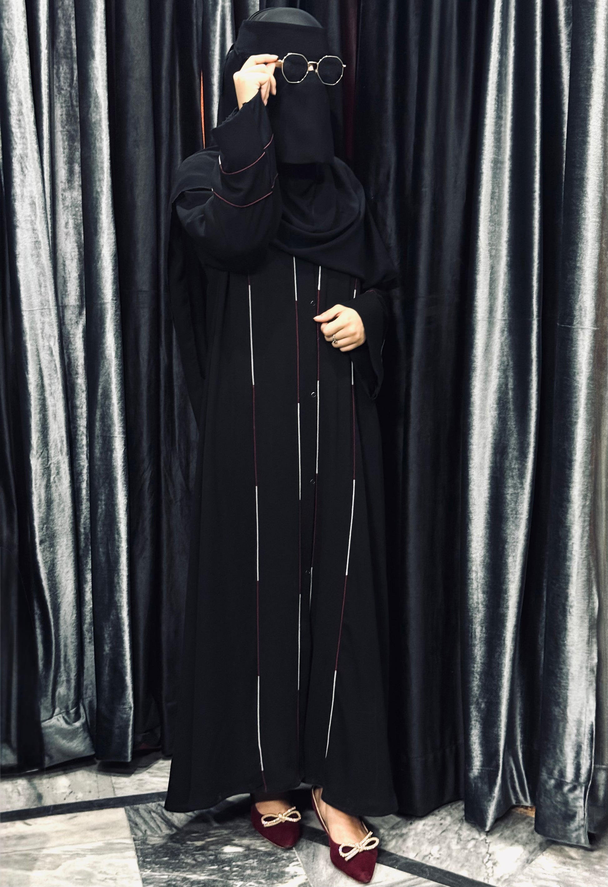 This elegant, front-open black abaya makes a sophisticated statement with its unique double-line contrast. It features crisp white and rich mehroon piping that runs down the front opening and along the cuffs of the sleeves, adding a refined pop of color and definition. This design is both timeless and eye-catching, making it a versatile choice for any occasion where you want to look polished and graceful.