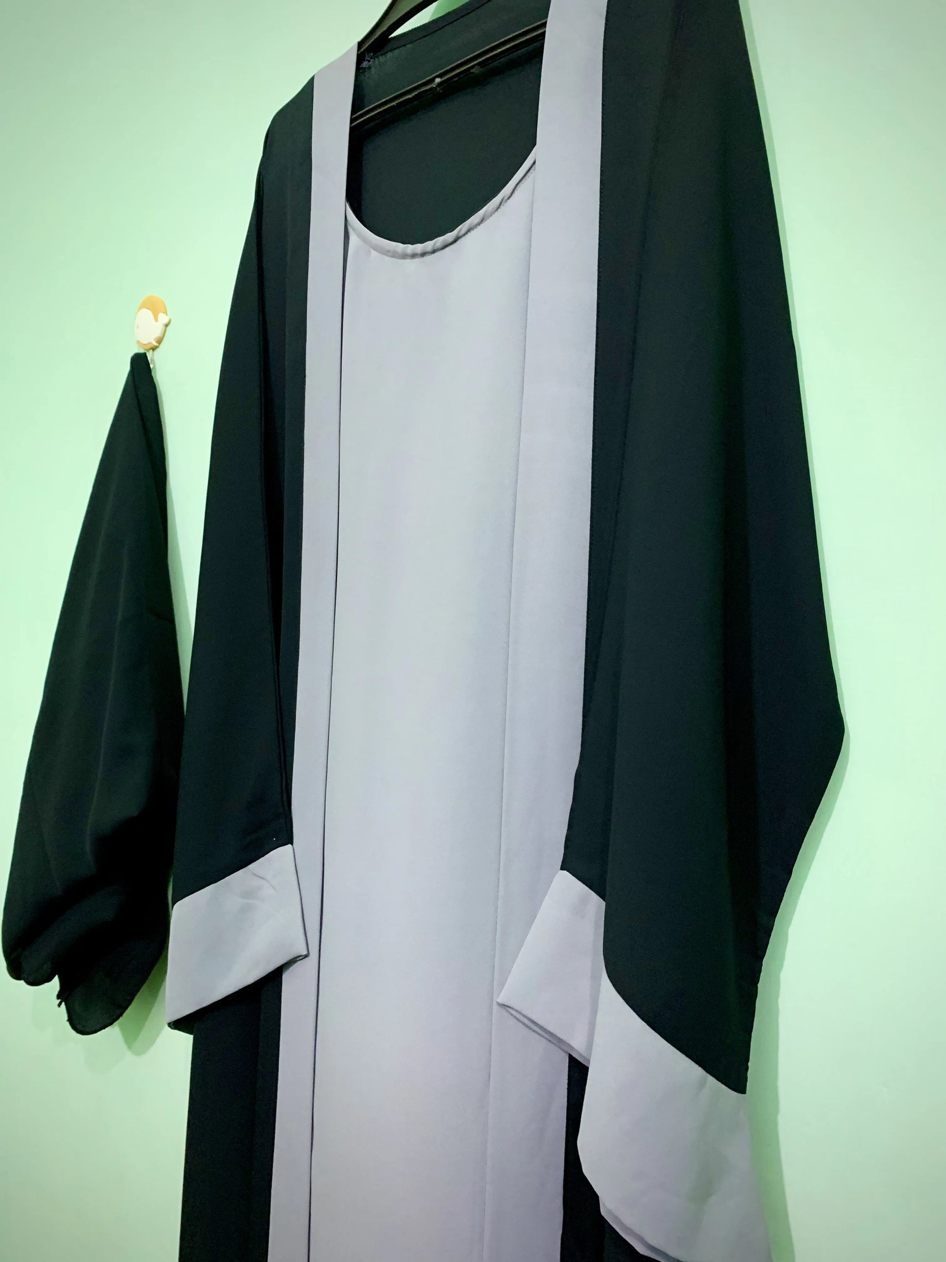 The Black & Grey Panel Abaya features a modern two-tone design with a soft grey center panel and matching sleeve cuffs, outlined by a black frame for a bold contrast. It comes with a matching hijab, making it an elegant yet simple choice for both daily wear and special gatherings.
