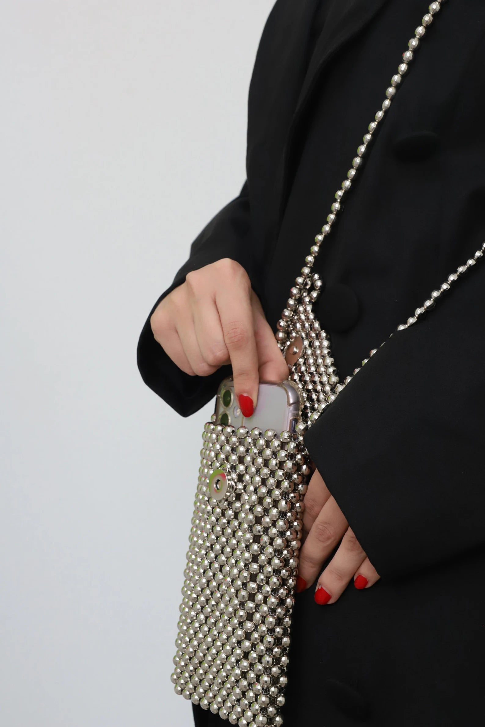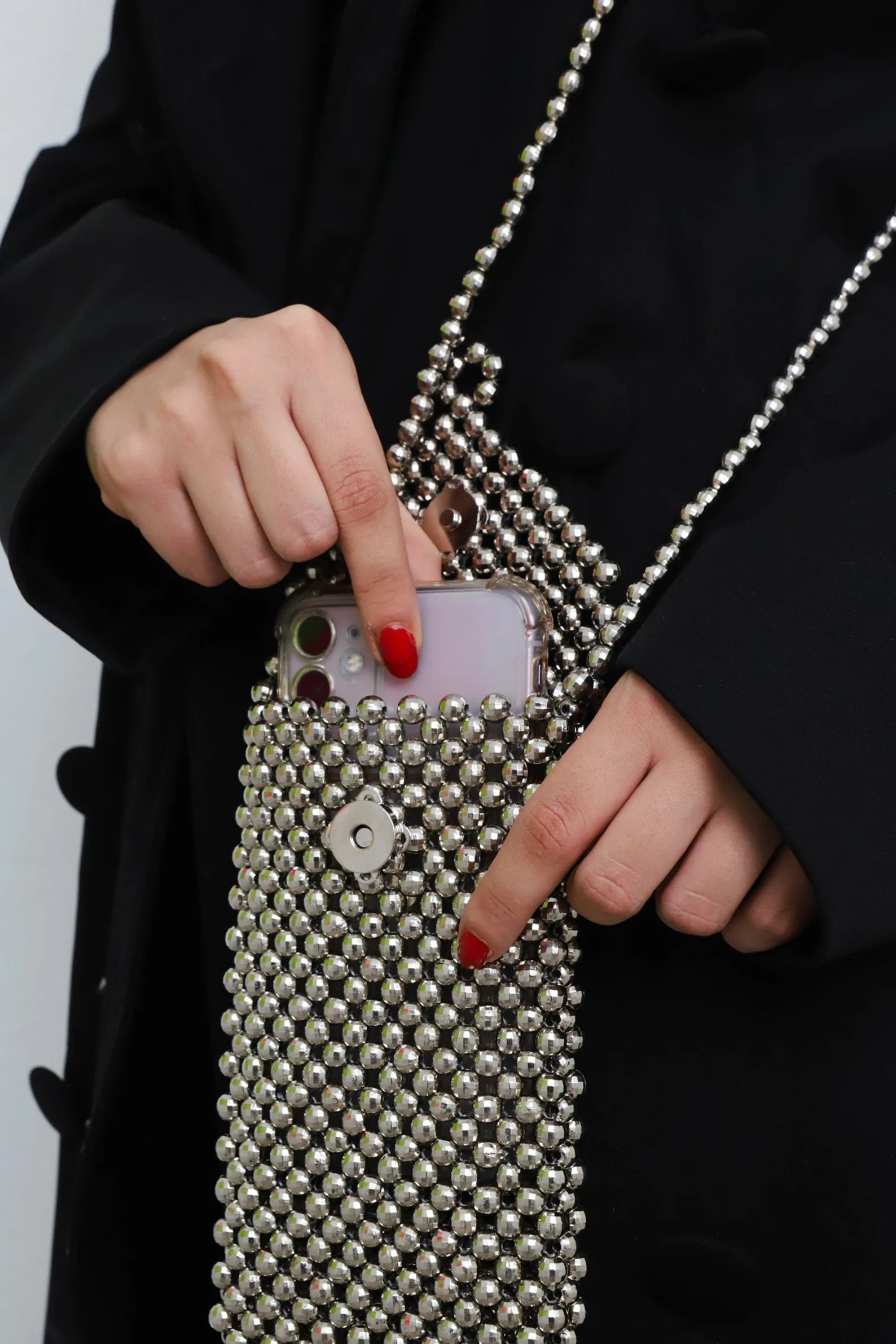 Add sparkle to your everyday with this elegant silver beaded mobile bag. Handcrafted with glossy metallic beads, it’s designed to keep your phone secure while doubling as a chic accessory. The slim crossbody style offers hands-free convenience, while the magnetic closure ensures safety. Perfect for casual outings, events, or when you just want to carry the essentials in style.