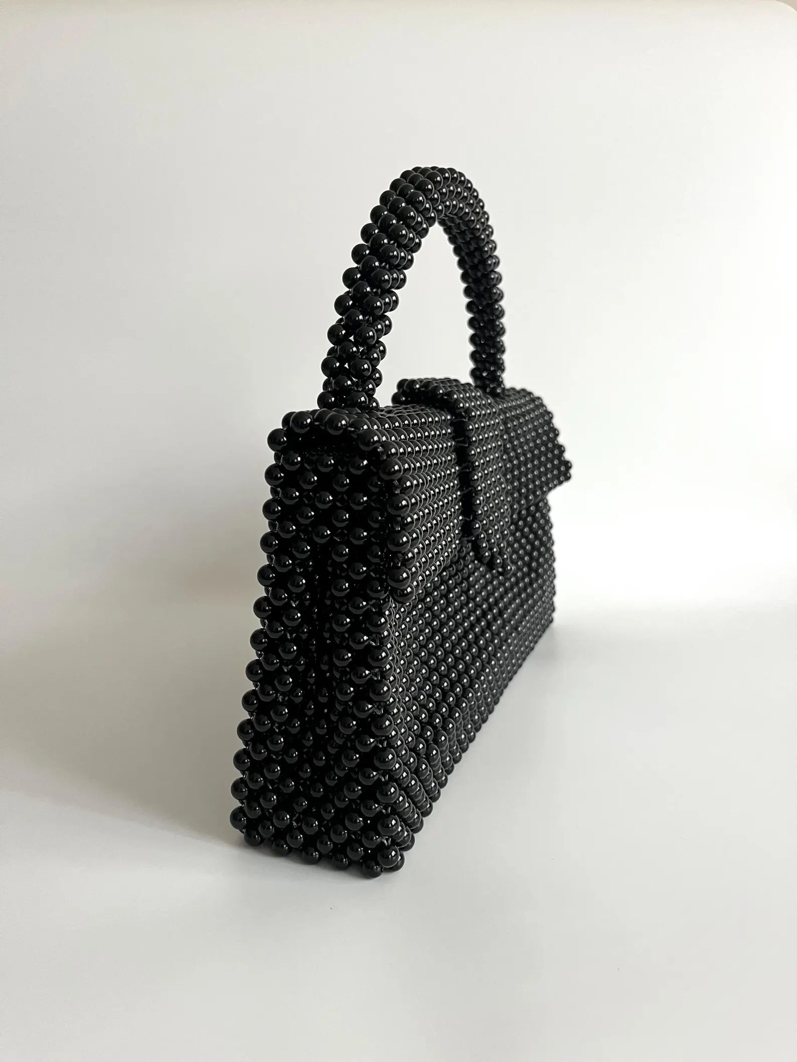 Elevate your evening wear with the Jet Noir Mini Top Handle, a luxurious handmade statement bag crafted entirely from deep black faux pearls. Its structured, designer-inspired silhouette and secure magnetic closure exude sophistication. This elegant mini clutch is perfect for parties, galas, or any special occasion where you want a dramatic touch. It’s ideal for carrying your essentials, making it the ultimate must-have accessory for a sleek, monochromatic look.