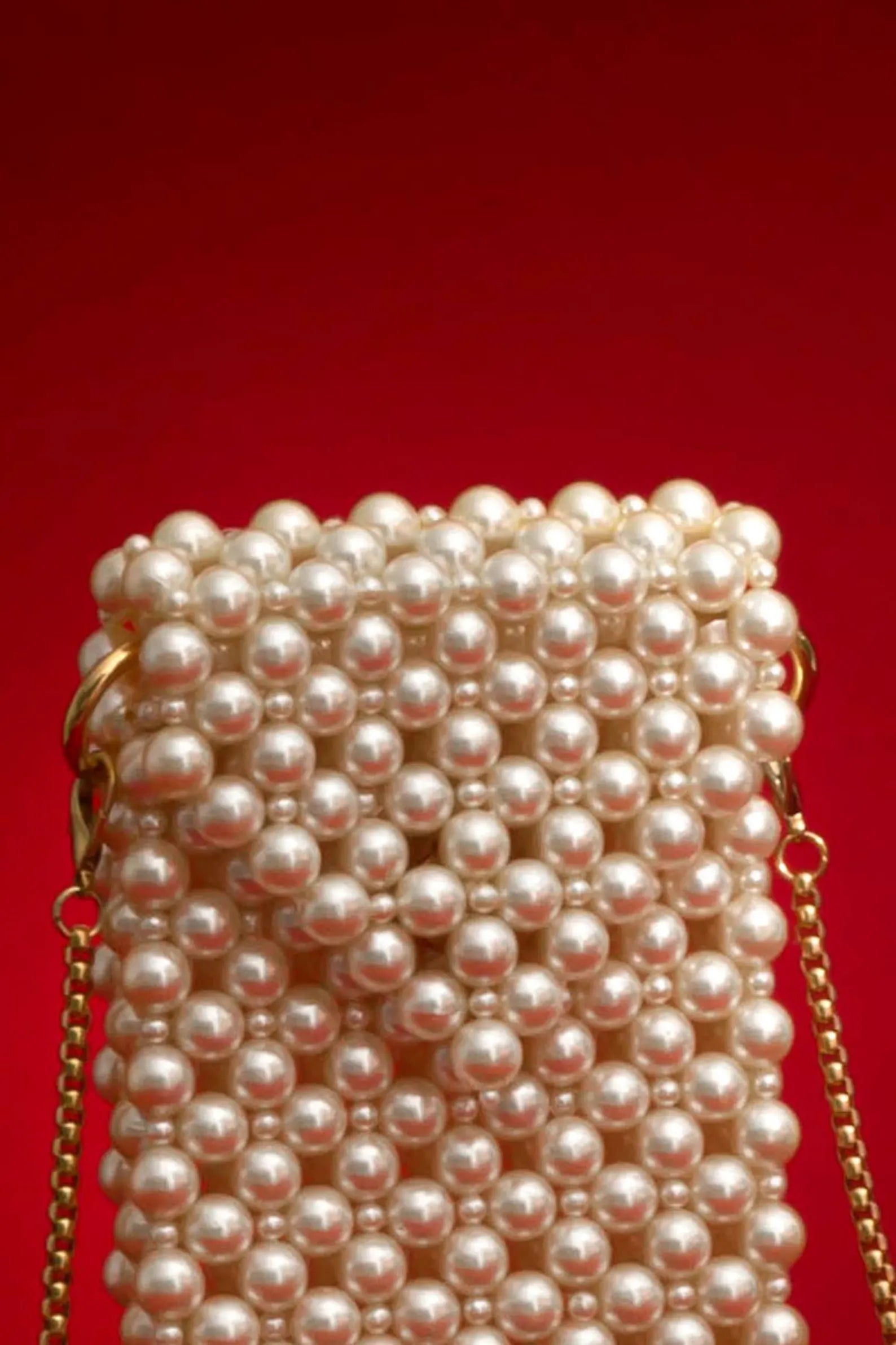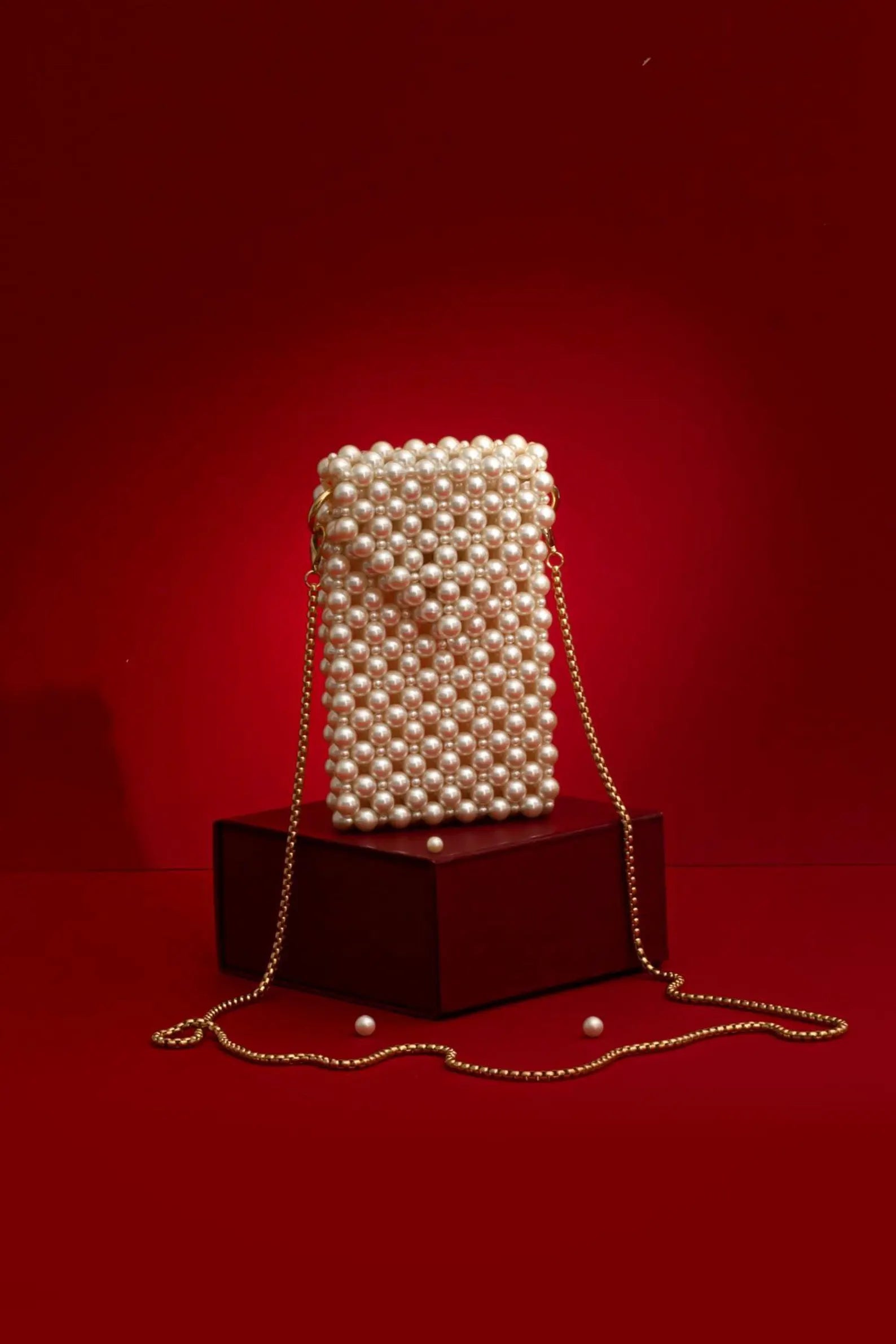 Elegant pearl crossbody bag with golden chain, perfect as a mobile pouch, evening bag, or party handbag. Handcrafted with premium pearls, lightweight yet durable — a stylish must-have for weddings, parties, and daily use.